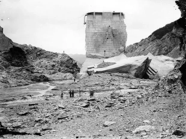 圣弗朗西斯水坝,由美国地质调查局的H.T. 斯特恩斯拍摄。维基媒体共享资源在1928年3月12日,临近午夜,穆尔霍兰刚刚完成例行检查后,水坝发生了崩溃,导致120亿加仑的水以140英尺的波浪冲下峡谷。在五小时内,洪水已行进54英里到达海洋,夺去了至少425人(可能多达600人)的生命:农民、牧场主、水务部门工人及其家人。没有官方的纪念公园。没有大型博物馆展览。没有为小学生组织的实地考察。这是加利福尼亚历史上第二大自然灾害(仅次于1906年旧金山地震),也是美国最大的土木工程灾难之一。(它被视为“自然”和“工程”灾难,说明了水坝崩溃的可能原因:水坝地点的地质条件与其单人工程团队的结合。)这场灾难成为全国新闻,一些报纸刊登了死者姓名的部分名单。在验尸官的调查中,穆尔霍兰表示他希望自己也在其中。尽管他被清除了任何刑事错误——陪审团认定他无法知道水坝位于古老的滑坡上——穆尔霍兰直到1935年去世前一直隐退。