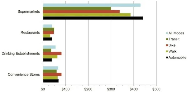 对 波特兰大都市区的78家企业 的分析发现,非驾驶者,包括骑自行车的人,是“竞争性消费者,平均花费与使用汽车的同行相似或更多。”因此,在一个月的时间里,骑自行车的人在杂货购物上的花费低于驾驶者,但在餐馆、酒吧和便利店的花费则更多。一个共同的主题浮现出来:骑自行车的人每次花费较少,但他们的出行次数更多。