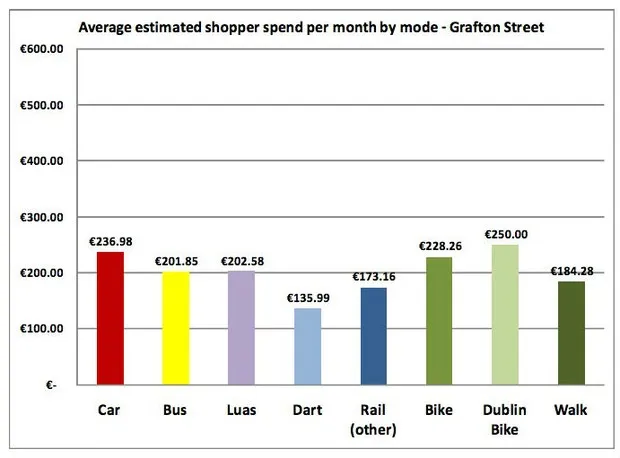 消费者行为在 都柏林的两条购物街上进行了研究:格拉夫顿街和亨利街。商家高估了他们的顾客中有多少是开车到达的——他们猜测格拉夫顿街是13%(实际上是10%),亨利街是19%(实际上是9%)——并低估了骑自行车的顾客。在拥有更好自行车基础设施的格拉夫顿街,骑自行车者的月消费几乎与司机消费持平:228欧元对237欧元。