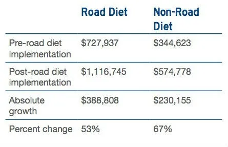 在 洛杉矶的约克大道上收集了商业数据,研究了在将车道改为自行车道的道路饮食前后情况。研究发现,这一变化对周围的商业、房地产价值和顾客购物模式“几乎没有影响”。销售税收入,作为商业成功的代理指标,在有新自行车道的约克段比没有新自行车道的段高,分别为1,116,745美元和574,778美元(尽管在两个段落中,道路饮食后收入都有所上升)。