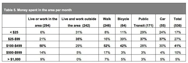 根据推算的频率和每次旅行的消费——即使不考虑食品、饮料和服务的消费——研究结果表明,骑自行车到市中心购物的顾客每月花费的钱与开车的顾客一样多或更多。