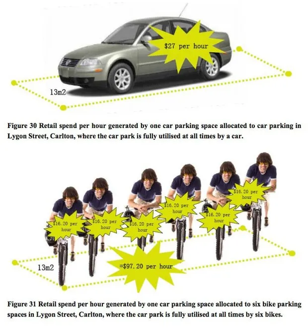 最佳信息图奖颁给对骑自行车者和司机购物行为的研究 在澳大利亚墨尔本。研究员艾莉森·李发现,司机每小时的消费比骑自行车的人多,约为27美元对16.20美元。但因为六辆自行车可以放进一个汽车停车位——总的每小时消费为97.20美元——李认为将这个空间用于自行车会带来经济收益。