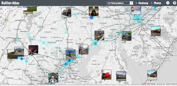 这是2010年冬天在费城暴风雪中狂奔的货运列车的照片,地图上以缩略图形式展示:
