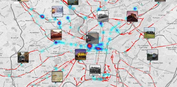 这是2010年冬天在费城暴风雪中狂奔的货运列车的照片,地图上以缩略图形式展示: