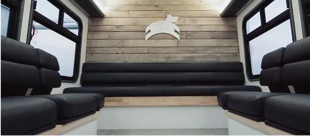 然后你坐在舒适的座椅上,旁边是看起来像是从一座古老、风化的谷仓撕下来的墙板: