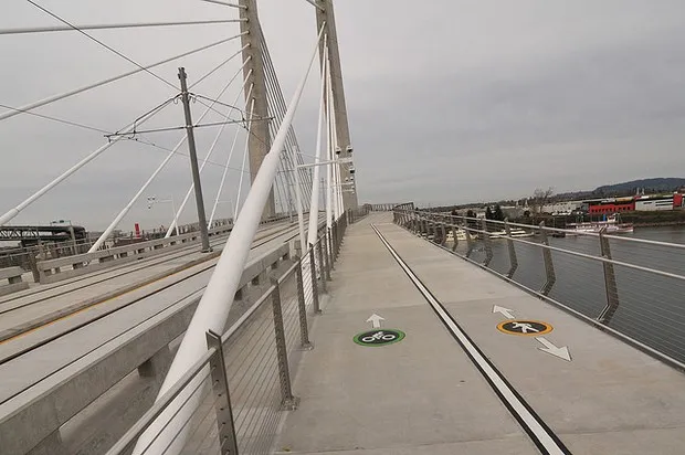 在 Tilikum 上骑行时,你会感受到另一个显著的不同,那就是它的现代美学和大胆设计。我们骑过的其他桥梁要么感觉像古董(钢铁桥、圣约翰桥、百老汇桥),要么是无聊且缺乏灵感的混凝土板(Burnside 和 Morrison)。相比之下,Tilikum 令人着迷。锋利的边缘、拉丝铝制栏杆和钢缆,与向天空延伸的管状白色缆绳形成鲜明对比,真是值得一看。