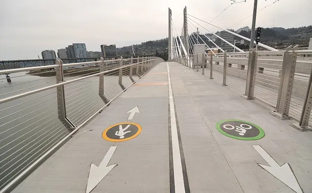 在 Tilikum 上骑行时,你会感受到另一个显著的不同,那就是它的现代美学和大胆设计。我们骑过的其他桥梁要么感觉像古董(钢铁桥、圣约翰桥、百老汇桥),要么是无聊且缺乏灵感的混凝土板(Burnside 和 Morrison)。相比之下,Tilikum 令人着迷。锋利的边缘、拉丝铝制栏杆和钢缆,与向天空延伸的管状白色缆绳形成鲜明对比,真是值得一看。