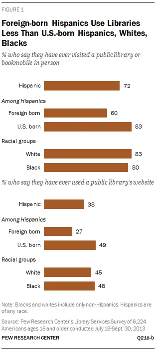 根据他们的调查,只有72%的拉丁裔报告说曾经访问过图书馆,而大约80%的白人和黑人美国人则如此。使用图书馆的外籍拉丁裔移民的比例甚至更低——仅为60%: