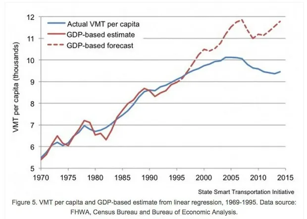 他们的一个最强有力的论点是,驾驶与经济扩张之间的联系今天远比历史上要弱。下一个图表对此一目了然。桑德奎斯特和麦卡希尔报告称,在过去的几十年里,GDP与车辆行驶里程是相辅相成的。但这一情况在1995年左右发生了变化。从那时起,如果你用GDP来预测汽车使用,你将大大高估驾驶里程——在2014年约高估了22%。