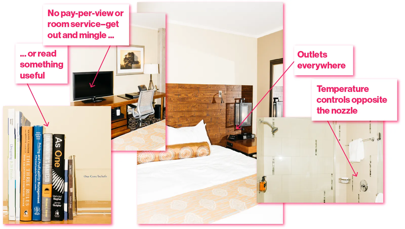 许多设计理念来自德勤的顾问,他们不断旅行,可以指出标准商务酒店的不足之处。到处都有电源插座——不需要爬来爬去插入熨斗。每张床旁边都有一个有线遥控器,可以控制房间内所有的灯光和温控器。玻璃墙淋浴间的水温旋钮位于喷头的对面墙上,方便在进入之前调节水温。