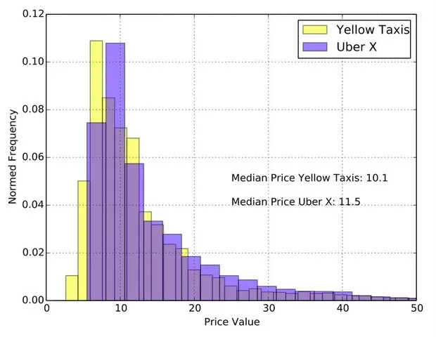 由比利时纳穆尔大学的弗谢沃洛德·萨尔尼科夫领导的团队进行了所谓的“首次正面比较”UberX和黄色出租车票价的研究。萨尔尼科夫的团队收集了2013年在纽约市进行的黄色出租车行程的起点、终点和票价的数据集。然后,利用Uber在2014年8月授予的API访问权限,他们确定了同样的行程在UberX上的费用。