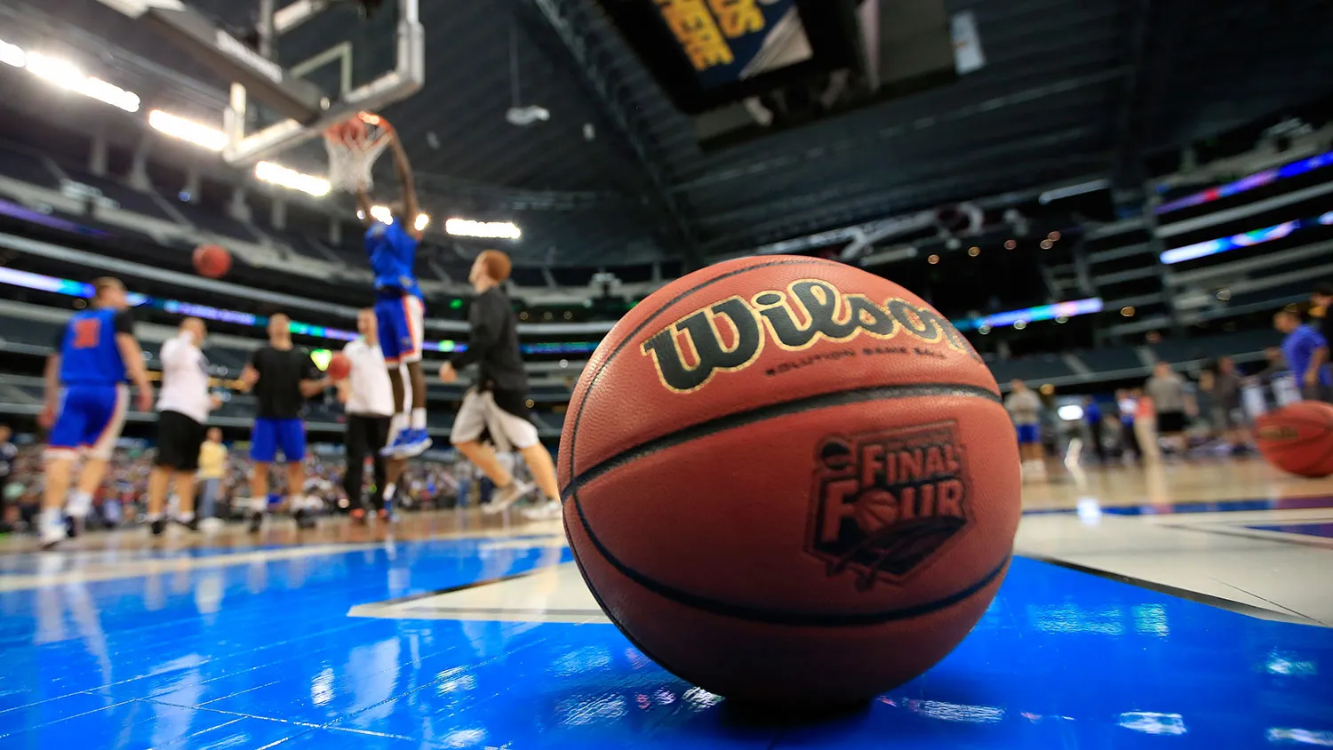 带有决赛四强标志的威尔逊篮球在2014年4月4日于德克萨斯州阿灵顿的AT&T体育场,佛罗里达大学的训练中被看到。