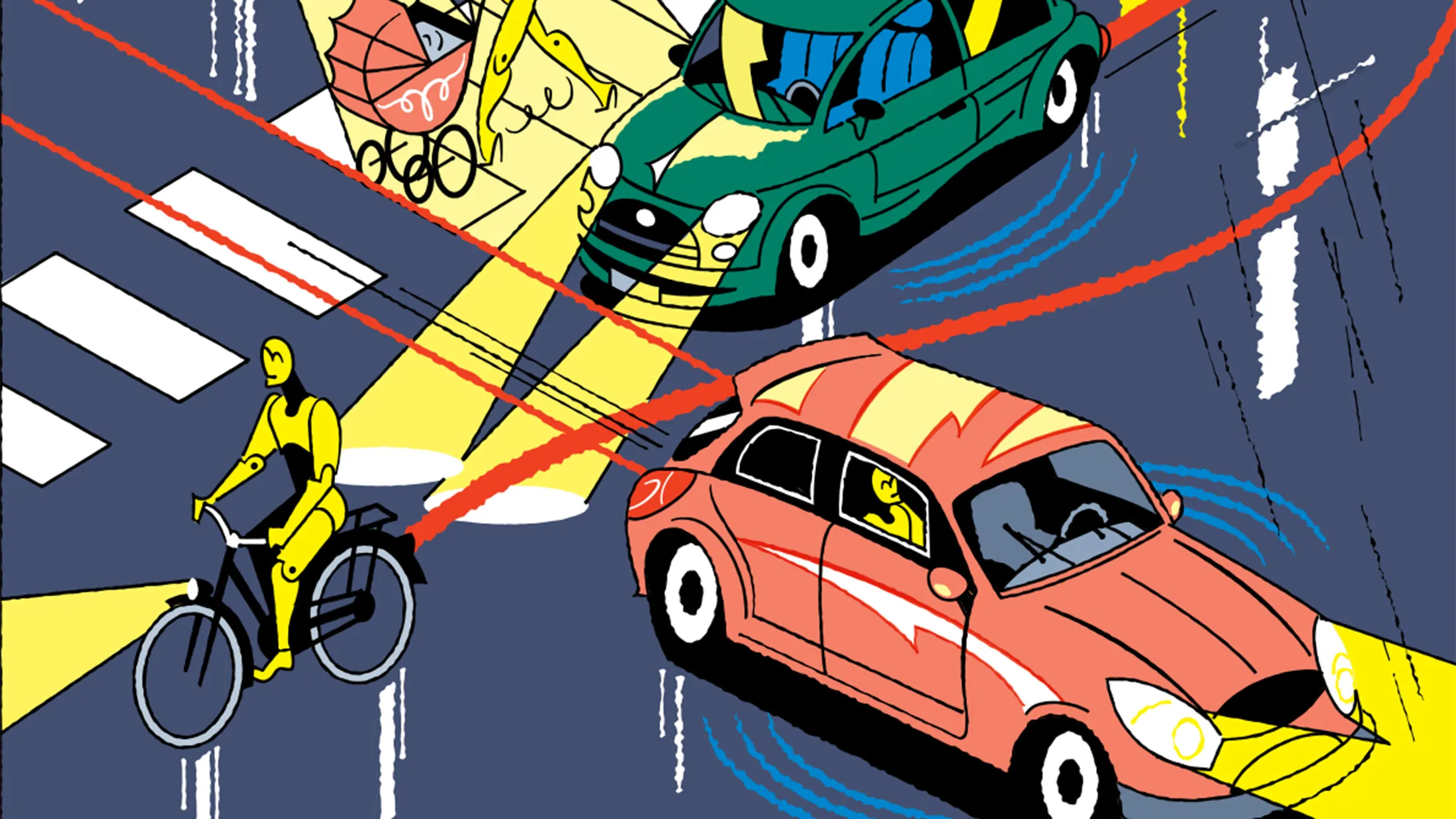 插图:维克托·哈赫曼一位母亲推着婴儿车在繁忙的城市街道上违规穿行。在两辆停放的汽车之间穿行,部分被一辆公交车遮挡,她将婴儿车推入交通中,然后在一辆快速驶来的汽车逼近时停住了。那辆车会及时停车吗?还是会撞倒母亲和孩子?这并不重要:这位妈妈是一个机器人,而那辆车是一辆在假街道上巡航的无人驾驶汽车。