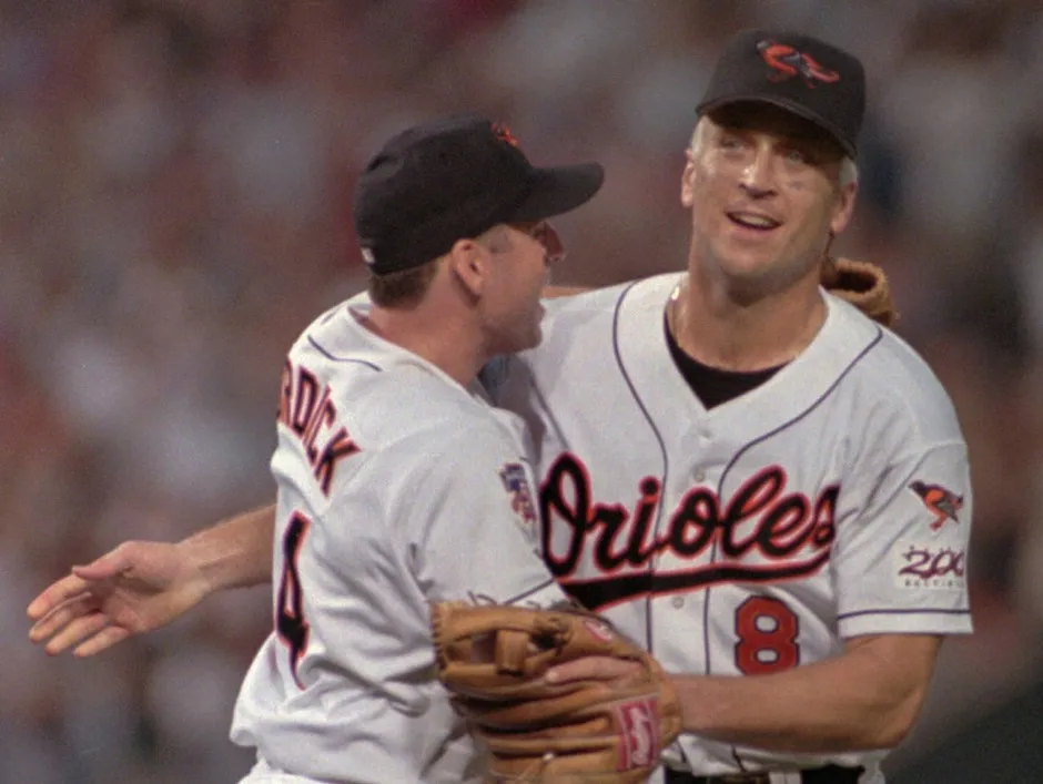 纪念巴尔的摩市200周年的补丁可以在卡尔·里普肯(右)庆祝与队友迈克·博尔迪克在1997年季后赛期间的袖子上看到。美联社/罗伯托·博雷亚我在1997年春天专注于我的四年级报告,关于巴尔的摩市,并观看我能找到的每一场金莺队的比赛。