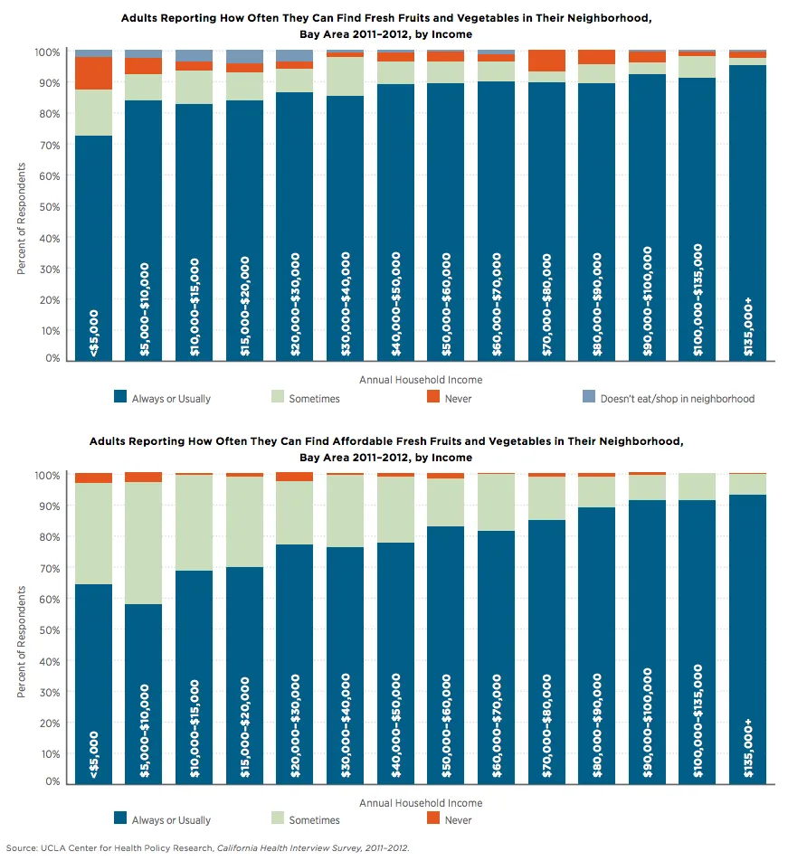将新鲜水果和蔬菜的获取与可负担的新鲜水果和蔬菜的获取进行对比,揭示了对健康食品需求的差异。SPUR地方政府可以在减少对不健康食品的需求和增加对健康食品的需求方面发挥作用。美国农业部的最新SNAP拨款正是为了实现这一目标,其中370万美元将支持加州市场匹配项目。该计划在农贸市场上按比例匹配SNAP购买金额(最高可达10美元)。因此,在农贸市场上花费10美元的食品券的人可以获得20美元的食品,双倍提升了福利的购买力。