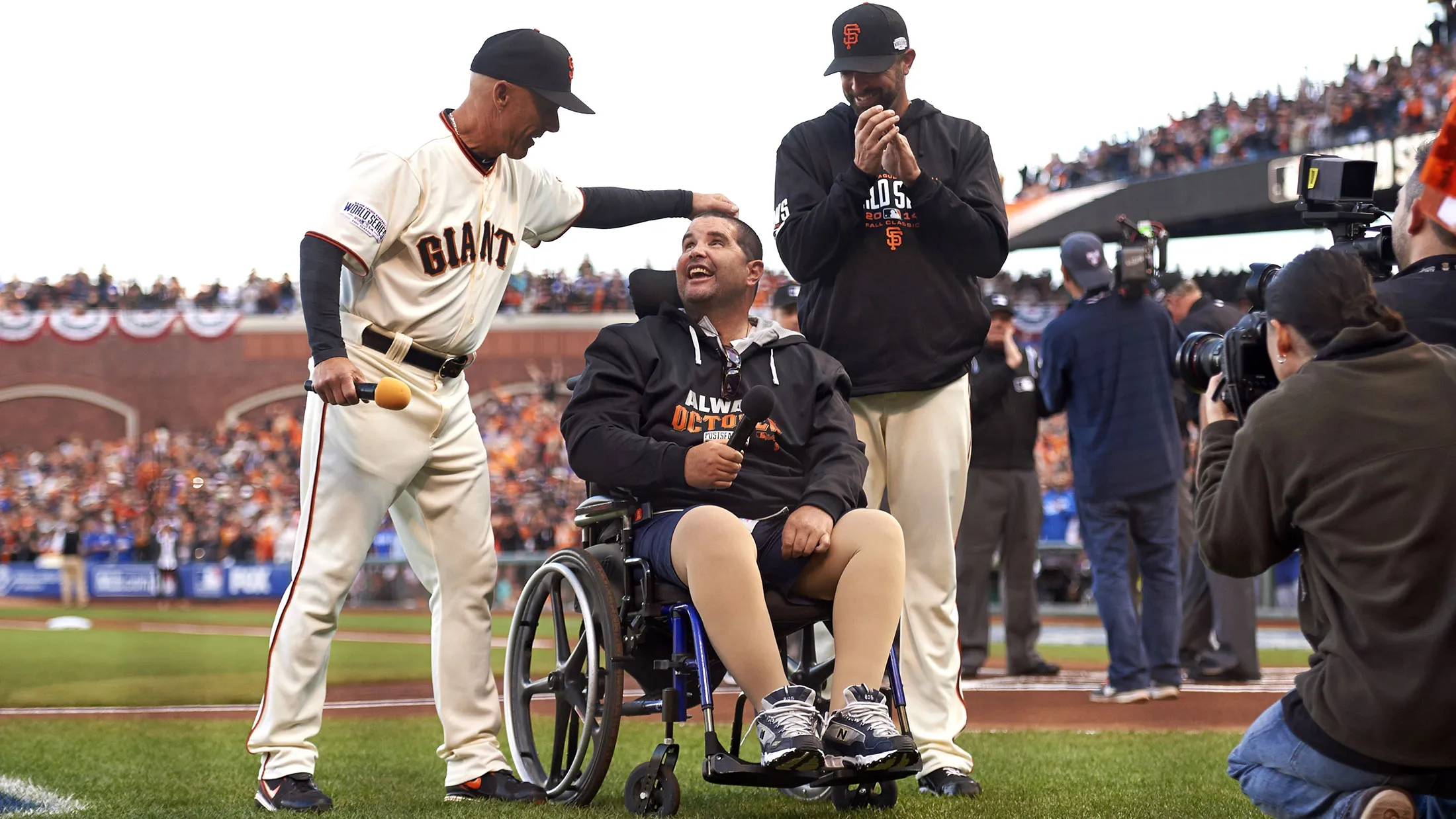 旧金山巨人队球迷布莱恩·斯托(Bryan Stow)在2014年10月25日于AT&T公园与三垒教练蒂姆·弗兰纳里(Tim Flannery)和杰里米·阿费尔特(Jeremy Affeldt)一起宣布“开始比赛!”之前。