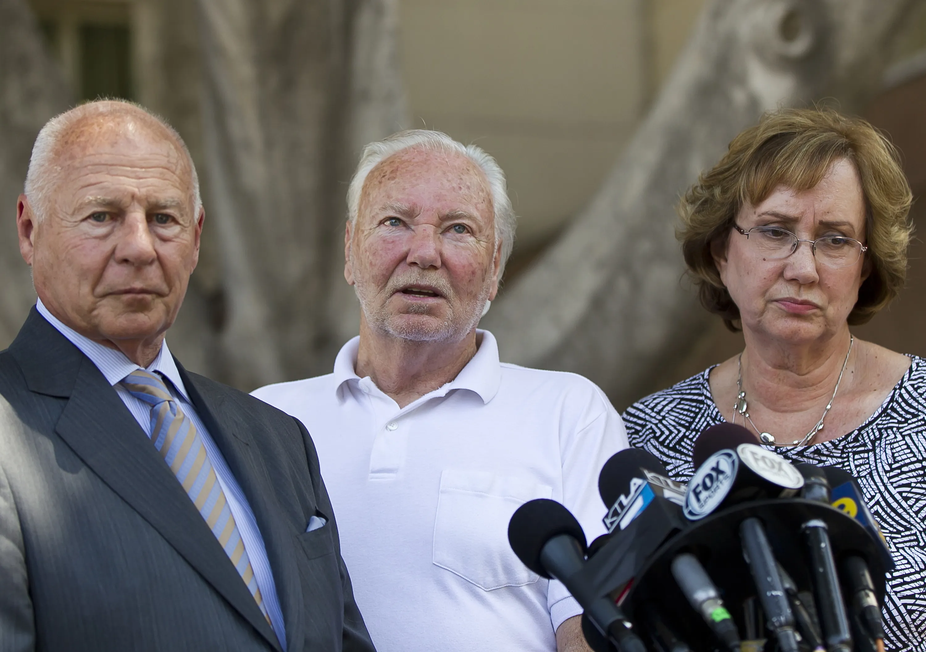 律师托马斯·吉拉尔迪(左)与大卫·斯托和他的妻子安在2014年7月9日星期三洛杉矶法院外。