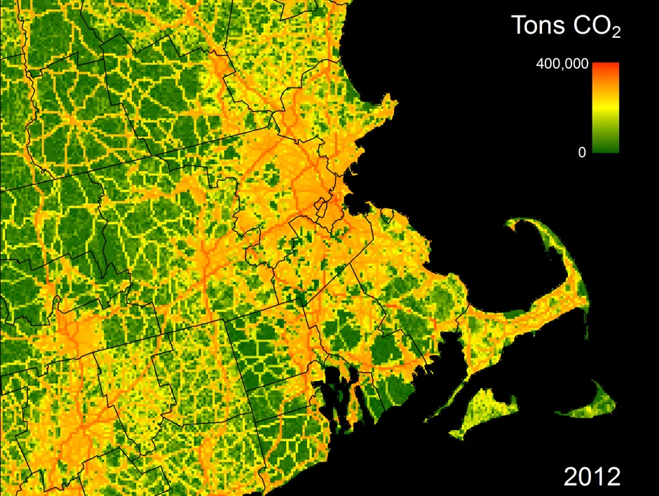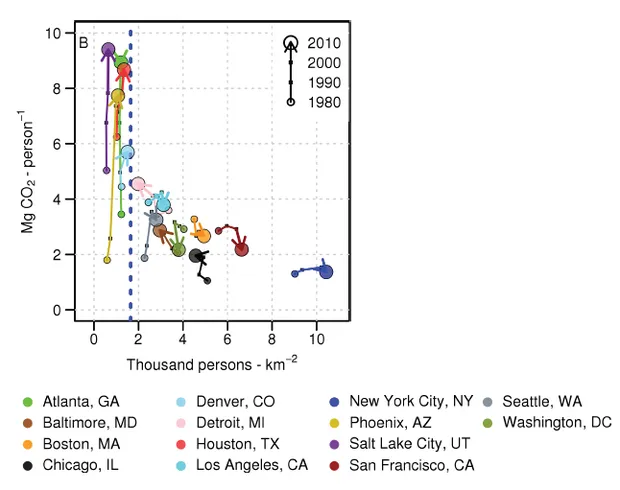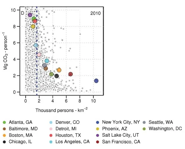 14个城市大都市的人均汽车碳排放率与城市密度的相关性。纽约(蓝色)是最密集的,且人均碳排放率最低。盐湖城(紫色)是密度最低的,且人均汽车碳排放率最高。PNAS生活在密集市中心的人们通常以更环保的方式出行,这一点仍然成立。正如上面的图像所示,与强大的公共交通网络相关的密集大都市居民——旧金山、波士顿、纽约、芝加哥——在2010年所产生的车辆二氧化碳排放水平较低。与此同时,像盐湖城、休斯顿和亚特兰大这样的扩展大都市的居民,通常通过驾驶产生更高的碳排放量。