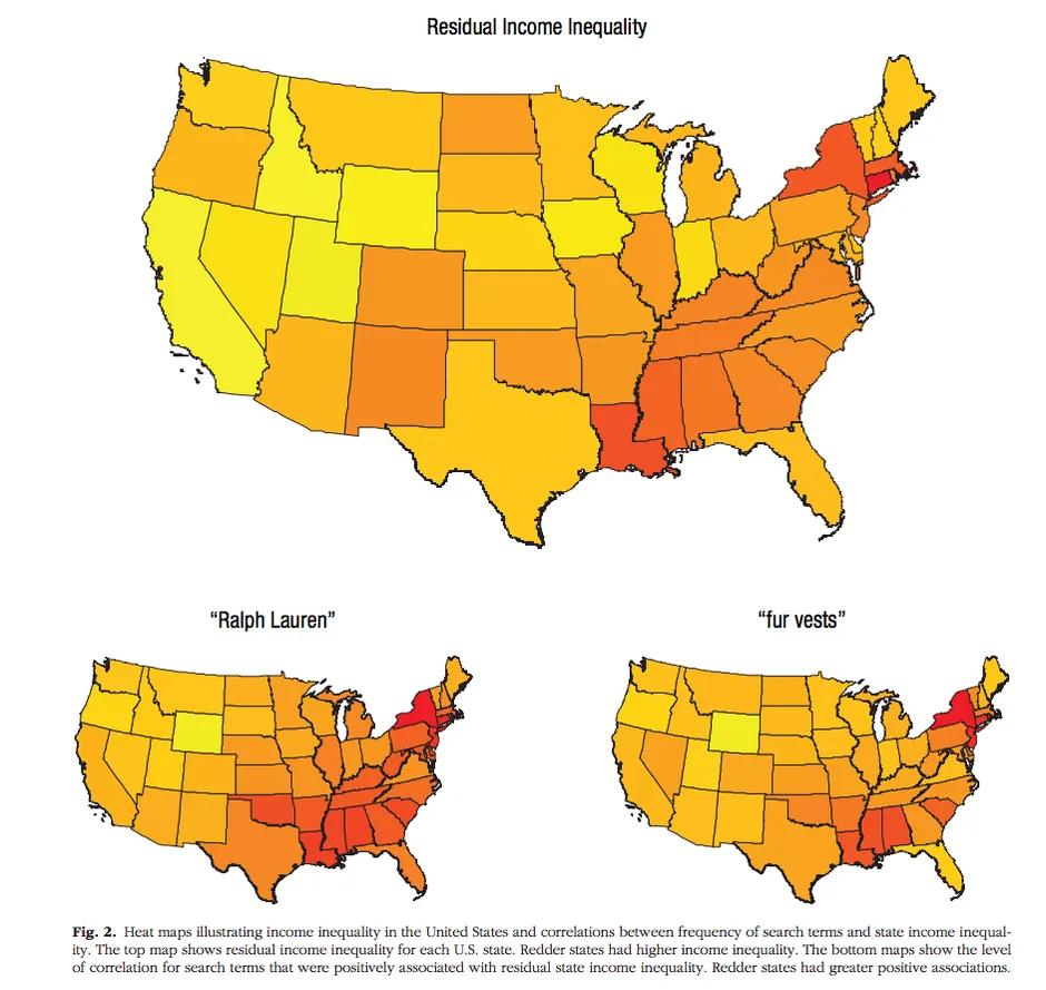 基于这些结果,研究人员创建了州热图,以显示收入不平等及其与地位搜索词的相关性。像路易斯安那州这样的红色州,收入不平等程度较高(下方,上方),并且与“拉尔夫·劳伦”(左下方)和“毛皮背心”(右下方)等搜索词的相关性也较高: