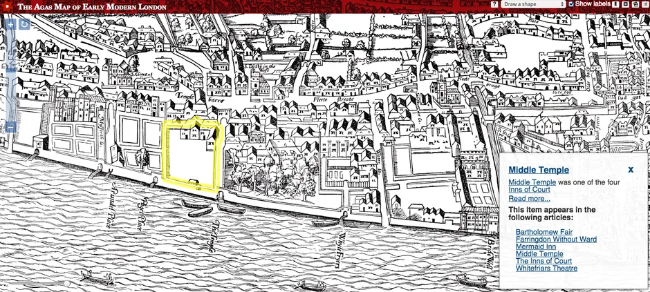 詹斯塔德的互动版本从数据库中提取信息,包含当时城市的 地点、 人物、 组织,以及关于 参考 材料 的信息,涉及伦敦的 早期现代时期。这些数据被叠加到“阿加斯”基础地图上。因此,如果你点击中殿建筑(如下所示),例如,地图将给你一个关于它是什么以及它在莎士比亚时代如何使用的概念: