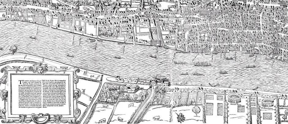 一个互动地图项目使这幅1561年伦敦地图的细节栩栩如生。由MoEML/伦敦大都会档案馆,伦敦市提供对城市的引用经常出现在莎士比亚的诗歌和戏剧中。举个例子,这里有一句来自《错误的喜剧》: