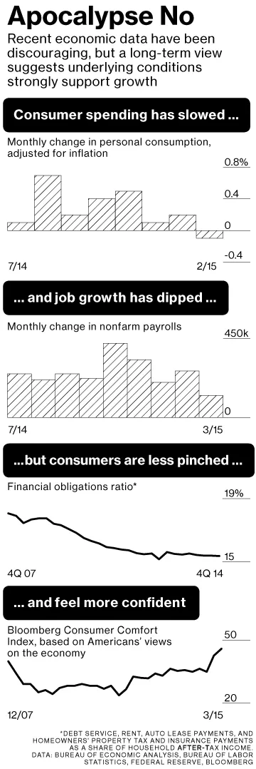 这些因素加起来形成了一个乐观的消费者。每周的彭博消费者舒适指数达到了2007-09年经济衰退前的最高水平。美国人在3月底对购买气候的评估是自2007年3月以来的最佳表现。尽管冬季恶劣天气和西海岸港口劳工中断,但“我不会说消费者在恶化。”彭博社高级研究分析师普纳姆·戈亚尔说。