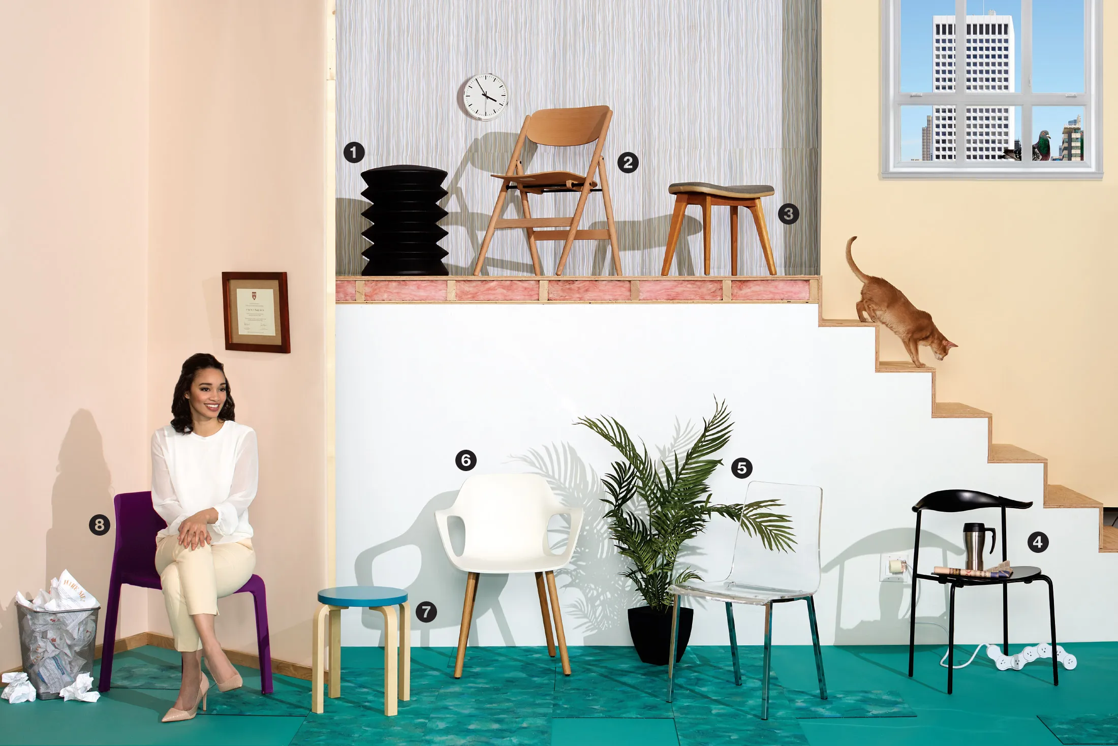 摄影师:David Brandon Geeting 为 Bloomberg Businessweek;布景:Yaron Pardo;道具造型师:Priscilla Jeong;造型师:Julie Simon;发型和化妆:Rebecca Garcia1. Alan Heller 的 ErgoErgo 凳子100美元;momastore.org这是一种平坦的运动球凳,采用灵活的塑料,前后摇摆,鼓励你在坐着时收紧核心以保持稳定。如果你在一家白领公司工作,可以试试;它会形成很好的对比。