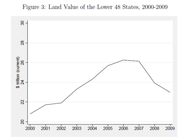 路透社/安迪·克拉克根据美国经济分析局(BEA)发布的 新数据 [PDF],2009年构成美国本土的土地总价值为23万亿美元。这大约相当于当年美国国内生产总值的160%,当时为14.5万亿美元。根据BEA的研究结果,美国土地的价值在2006年达到26.2万亿美元的峰值,随后在大萧条之前回落至23万亿美元。下面的图表显示了这一趋势。