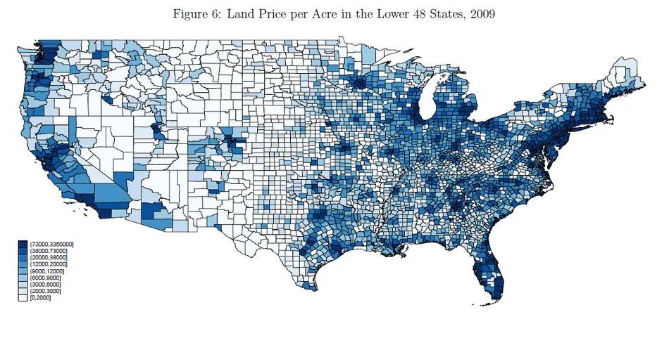 毫不奇怪,土地的价值在全国范围内相当不均匀且波动较大,如下图所示。它绘制了美国各县每英亩土地的价值,最深的蓝色表示土地最昂贵的地方。这个模式主要是双海岸的,土地价格在波士顿-纽约-华盛顿走廊和东海岸的佛罗里达部分地区最高,以及在加利福尼亚北部和南部以及西部的西雅图附近。