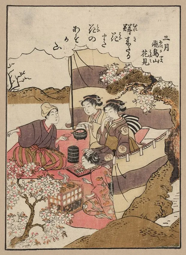 这幅18世纪的印刷品展示了在盛开的樱花树下的茶会。北尾重政,国会图书馆这里还有两幅其他的樱花印刷品: