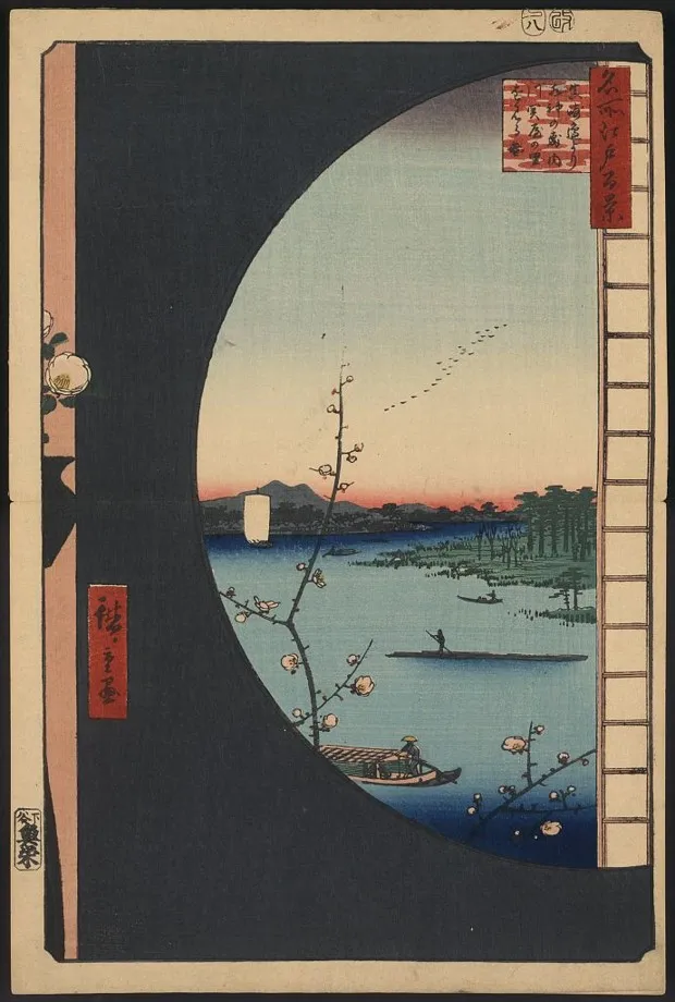 半圆形的船只,前景是樱花。安藤广重/国会图书馆虽然春季樱花观赏是收藏的核心部分,但四个季节都得到了很好的代表;国会图书馆解释道: