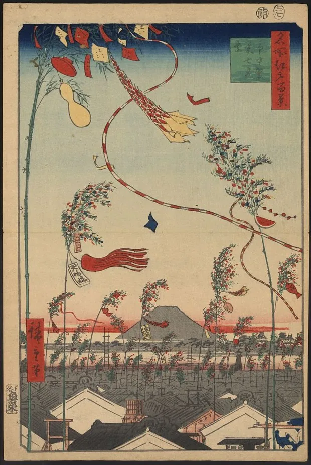 在七夕夏季节日中,屋顶上装饰着纸条和剪纸的竹子。安藤广重/国会图书馆