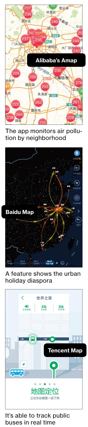 古代中国的制图师以其在准确性和比例上的创新而闻名。随着国家的三大互联网公司竞争吸引用户使用他们的地图软件,他们的关注点基本保持不变,只是增加了一些高科技的元素。在线市场阿里巴巴、搜索引擎百度和即时通讯应用腾讯正在投入资金开发免费的地图应用,以吸引更多的移动用户。新用户所带来的位置信息受到广告商的青睐,他们可以向特定地点的人推送产品。自从五年前谷歌停止在中国提供搜索服务,抱怨政府审查后,谷歌地图的市场份额已降至个位数。