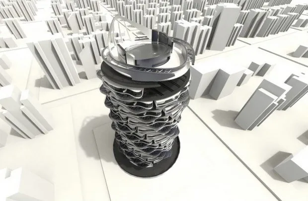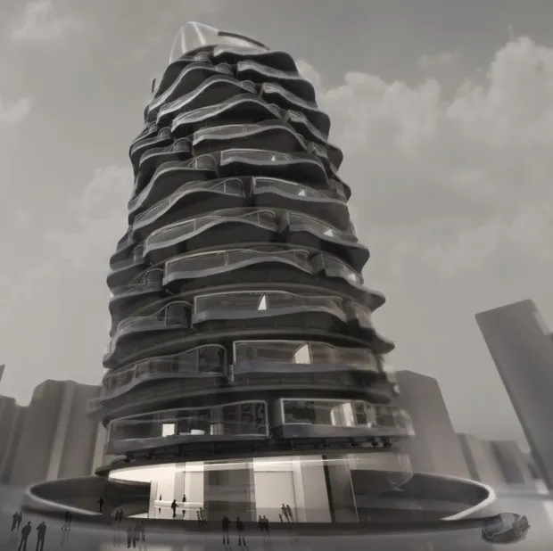“面向未来”,正如邱信在旧金山艺术大学开发的概念,将设有在中央柱子周围沿螺旋轨道滑动的公寓。为了防止巨大的火球,每个家庭的燃气和电力线路在移动前会自动断开,并在目的地的新端口重新连接。当然,所有人的前门在重新定位前都会锁上,以避免可怕的尸体雨。