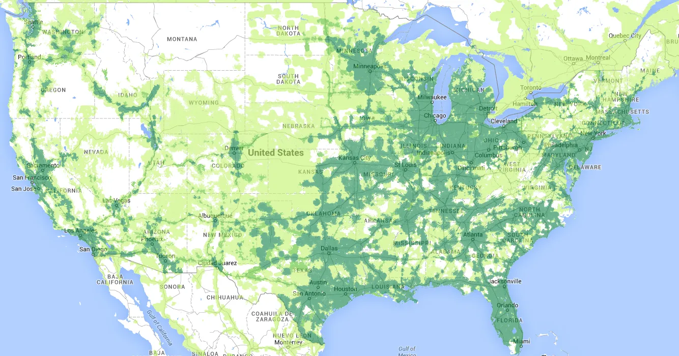 来源:谷歌4G LTE速度的覆盖范围(上图深绿色)并不像AT&T或Verizon拥有的优质网络那么广泛,后者拥有最广泛的网络。然而,对于大多数人来说,这并不需要。Sprint和T-Mobile网络的结合覆盖了大多数美国人居住的地区,而利用高速Wi-Fi网络的额外好处可能会为新客户敲定交易。