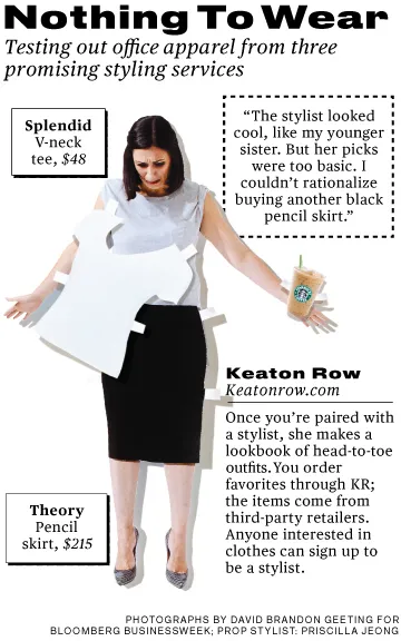 这些服务实际上效果如何?在Keaton Row上,我在几个小时内收到了来自旧金山造型师Nicole的消息。她发送了两个造型书,一个是休闲款,一个是更正式的——并不是我所要求的。所有选择的服装都是黑色、白色、灰色和海军蓝,尽管我已经表示自己非常开放于颜色和图案。值得一提的是,Nicole的选择——一条铅笔裙、一件V领T恤和一件丝滑的衬衫——看起来与我衣橱里的衣服非常相似。但我并不需要这些。