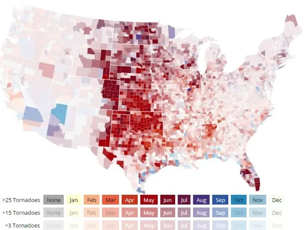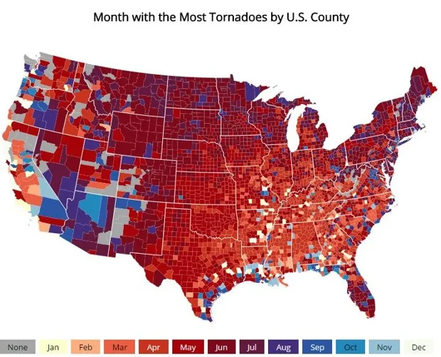 时刻关注天气预警总是有助于解答这个问题。但对于那些想提前了解几率的人,可以查看来自 美国龙卷风 的这张精彩地图。使用来自 风暴预测中心 的数据,它显示了美国大陆每个县一年中达到平均龙卷风季节高峰的月份。(更大、互动的版本 在这里。)