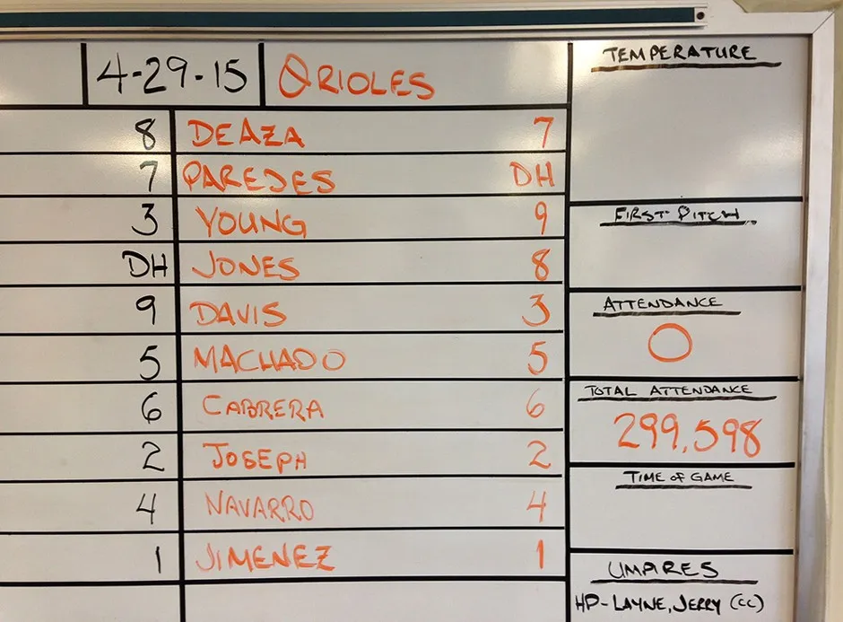 由于国民警卫队被派往巴尔的摩,且该市在周一因弗雷迪·格雷的死亡而发生骚乱后仍处于晚上10点的宵禁中,金莺队将他们与芝加哥白袜队的周三晚间比赛提前到下午2点。为了不在城市几十年来最暴力的一周中给当地安全资源带来压力,金莺队关闭了球场。