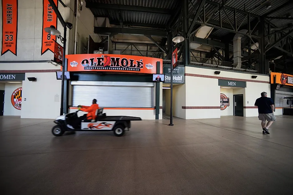 一名巴尔的摩金莺队的员工在周三比赛前驾驶一辆空的送货车穿过体育场。美联社照片/盖尔·伯顿
