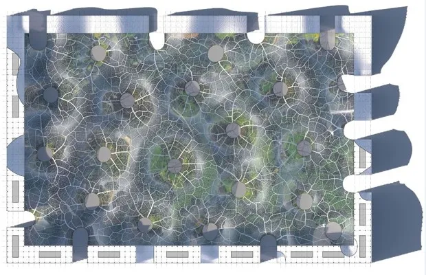 轻型结构系统的几何形状是通过一个模拟叶子或蝴蝶翅膀静脉发展的算法生成的。空气的加热和冷却是通过地源热交换系统完成的。项目所需的电力可以通过集成在顶篷表面的太阳能电池生成。