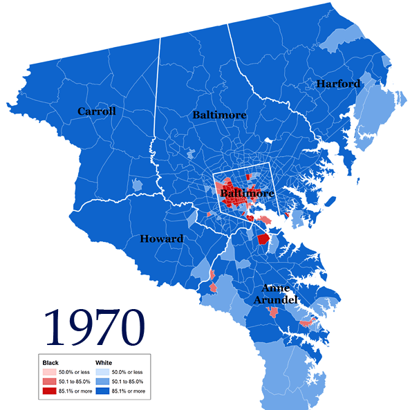 巴尔的摩的白人人口在20世纪后半叶急剧下降。与此同时,城市中黑人所占的比例迅速上升。