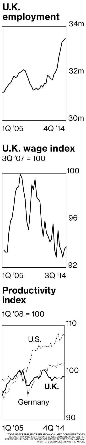 虽然就业增长强劲而工资疲软似乎很奇怪,但这些趋势可能有相同的解释:生产力低下。2008-09年,每小时的国内生产总值急剧下降。在2010-11年短暂反弹后,其增长率一直徘徊在接近零的水平。根据英格兰银行的数据,自维多利亚女王在位以来,每小时的工作产出没有如此严重的停滞(不包括两次世界大战后的复员)。这个数字如此糟糕,以至于引发了该国欧洲邻国的疑问。“这种持续的低生产力在历史上是独特的,尤其是与其他发达国家观察到的轨迹相比,”法国政府经济学家在四月份的一篇论文中表示。虽然法国工人可以在周五休假,仍然能比英国人生产更多的说法并不完全正确,正如工党影子商业秘书在二月份对BBC广播所说,但这与现实足够接近,以至于让包括卡梅伦在内的那些将法国总统弗朗索瓦·奥朗德的政策视为如何不管理经济的案例研究的人感到尴尬。