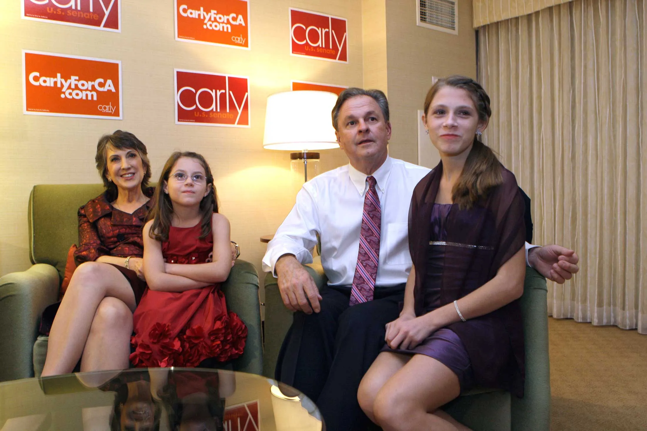 菲奥瑞娜在加利福尼亚州尔湾的加州共和党选举之夜总部的酒店房间里观看选举结果,时间是2010年11月2日,左起,她的孙女卡拉·特里比,当时7岁,她的丈夫弗兰克,以及孙女摩根·特里比,当时11岁。里德·萨克森/AP照片在2010年的竞选中,她在化疗期间秃头的情况下进行部分竞选,遭到博克斯的广告猛烈攻击,称即使菲奥瑞娜裁员数万名员工,她仍在购买和详细说明企业喷气机。