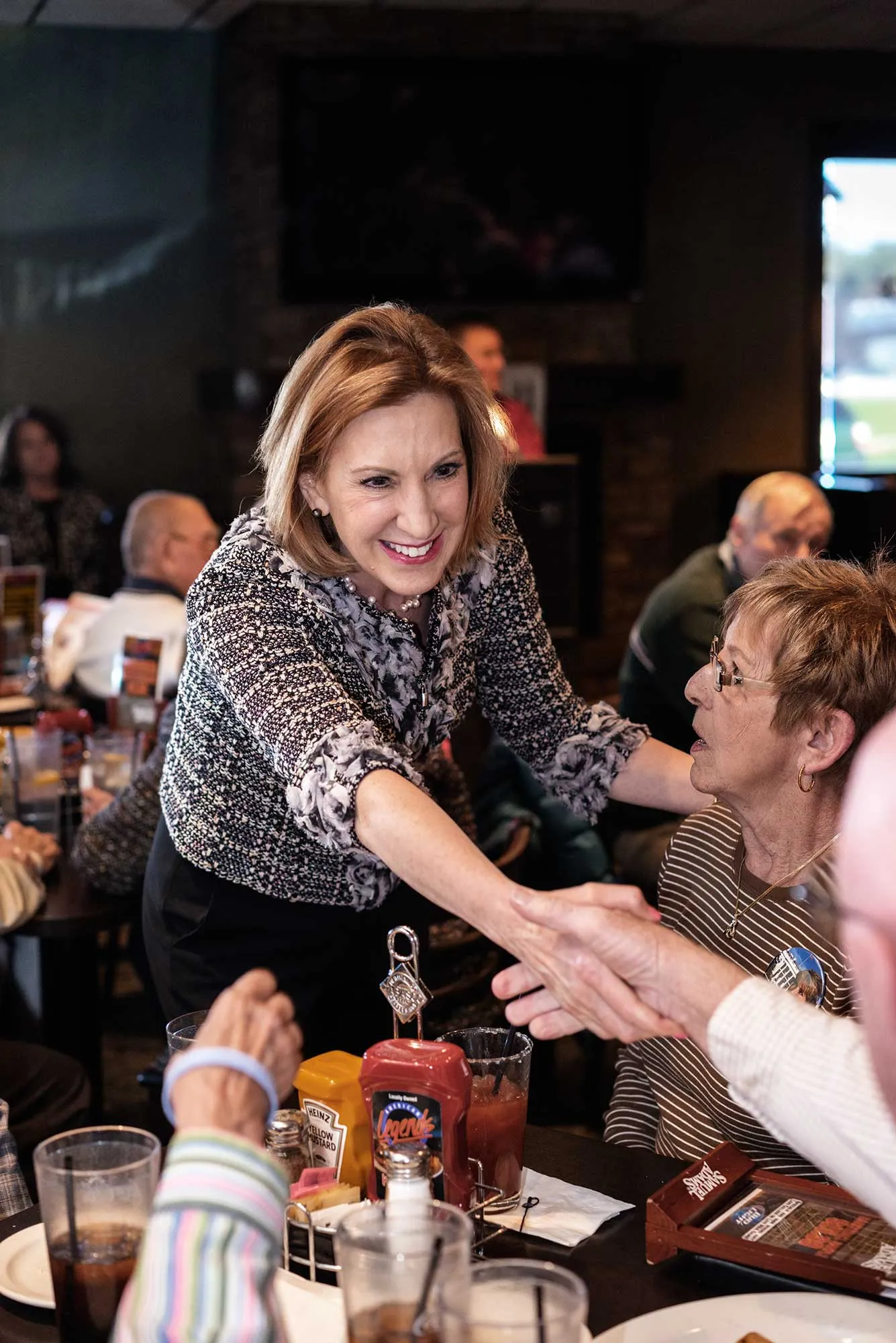 卡莉·菲奥瑞娜在2015年4月22日星期三于爱荷华州马歇尔敦的传奇美国烧烤餐厅拍摄。照片由巴雷特·埃姆克为《彭博商业周刊》拍摄与罗姆尼不同,她在建立联系方面毫无困难。在坦帕的活动结束后,在她握完每一只手并拍完每一张照片后,她对让我等了几分钟表示非常抱歉。与许多候选人不同,她对预计在5月4日宣布的竞选活动并没有表现得过于含蓄,这正好是在5月5日她的竞选书籍《迎接挑战:我的领导之旅》发布之前。(她早期的回忆录《艰难选择》,看起来与克林顿2014年的《艰难选择》非常相似,出版于2006年。)在距离她的竞选正式开始如此之近的情况下,菲奥瑞娜嘲笑任何会让她退出竞选的想法:“我不预见会有什么巨大的冲击迫使我说,‘哇,我真的计算错误了,’或者‘我真的没有建立起我认为需要的基础设施来真正实现这一目标。’”