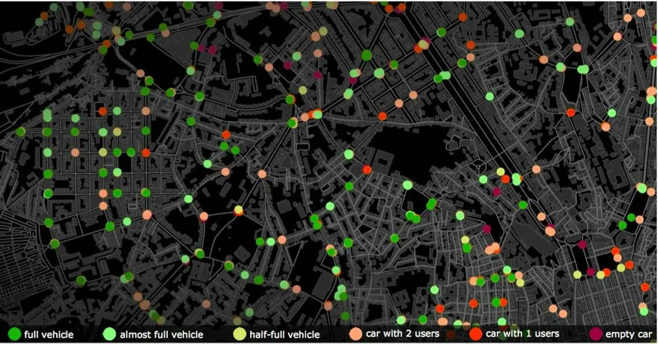 马丁内斯和合作者使用真实的出行数据来模拟如果各种规模的共享自动驾驶车辆主导葡萄牙里斯本的生活会是什么样子。一些场景设想这些出租车机器人与高容量公共交通合作——在里斯本的情况下,是地铁网络——而其他场景则考虑了没有公共交通的城市。(尽管出租车机器人在所有情况下都取代了当地公交车。)里斯本拥有50万城市居民和280万大都市区居民,是一个相当典型的中型城市,尽管其汽车拥有率(每千人217辆)在全球范围内处于较低水平。