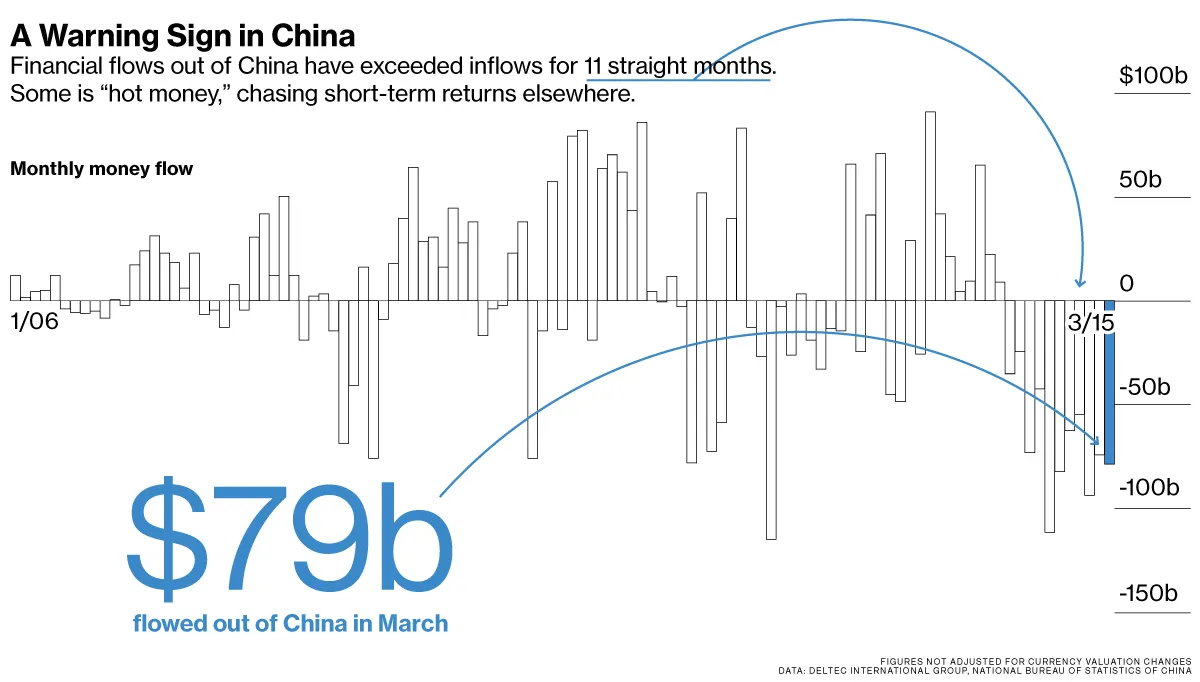 摄影师:大住智宏/彭博社当世界惊叹于中国股价的上涨时,资金正以至少十年来最快的速度悄然流出中国。苏格兰皇家银行首席中国经济学家路易斯·库伊斯估计,在截至3月的六个月中,中国的金融外流损失达3000亿美元。巴哈马投资公司Deltec International则将这一数字估计得更高。