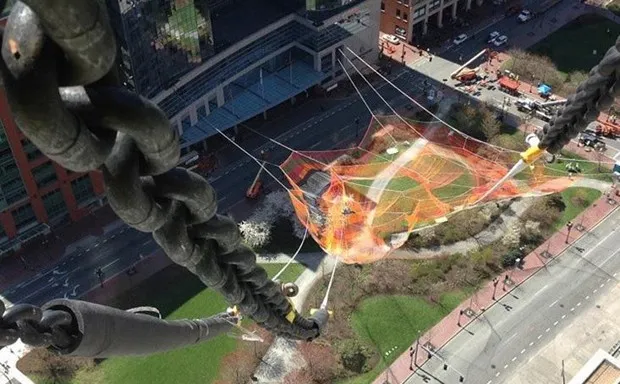 这件雕塑是通过手工拼接绳索和打结麻线,形成一个由超过五十万个节点相互连接的网状结构。当其中任何一个元素移动时,其他所有元素都会受到影响。它在规模和强度上都是宏伟的,但又如蕾丝般精致,能够流畅地响应不断变化的风和天气。它的纤维强度是钢的15倍,但极其轻便,使得雕塑能够直接与三座摩天大楼相连,成为硬边建筑的柔和对比。它是相互联系和通过韧性展现力量的物理体现。