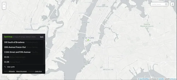 要使用地图,只需点击标记世界各地城市的小绿色音符。会弹出一个关于该城市的所有歌曲的播放列表,基于这个 维基百科列表。例如,点击纽约的音符,会显示2,707首关于这个城市及其各个社区的歌曲,按字母顺序排列: