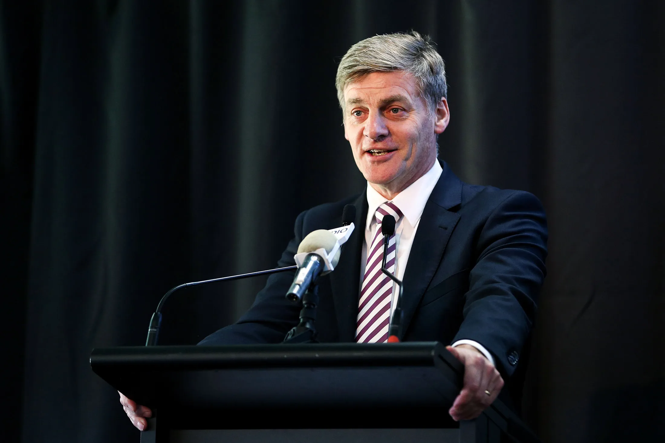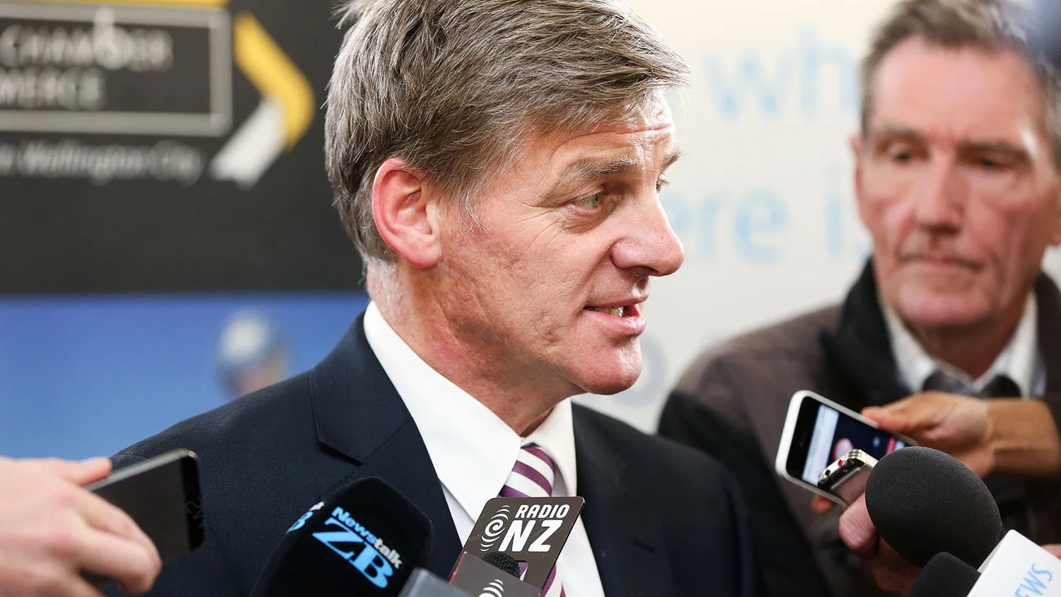 财政部长比尔·英格利什在2015年5月1日于新西兰惠灵顿的国会大厦发表预算前演讲后与媒体交谈。