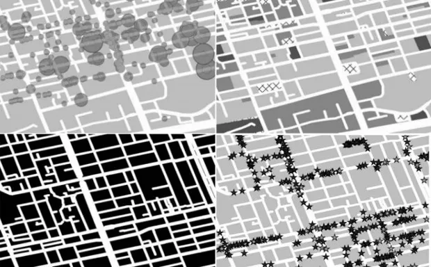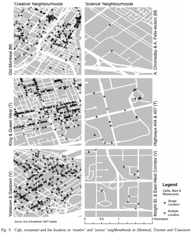 第三组图表绘制了咖啡馆、餐厅和酒吧等便利设施的位置。同样,基本模式重复出现。创意社区拥有这些饮食场所的密集丰富,而高科技、科学基础的地点则很少。